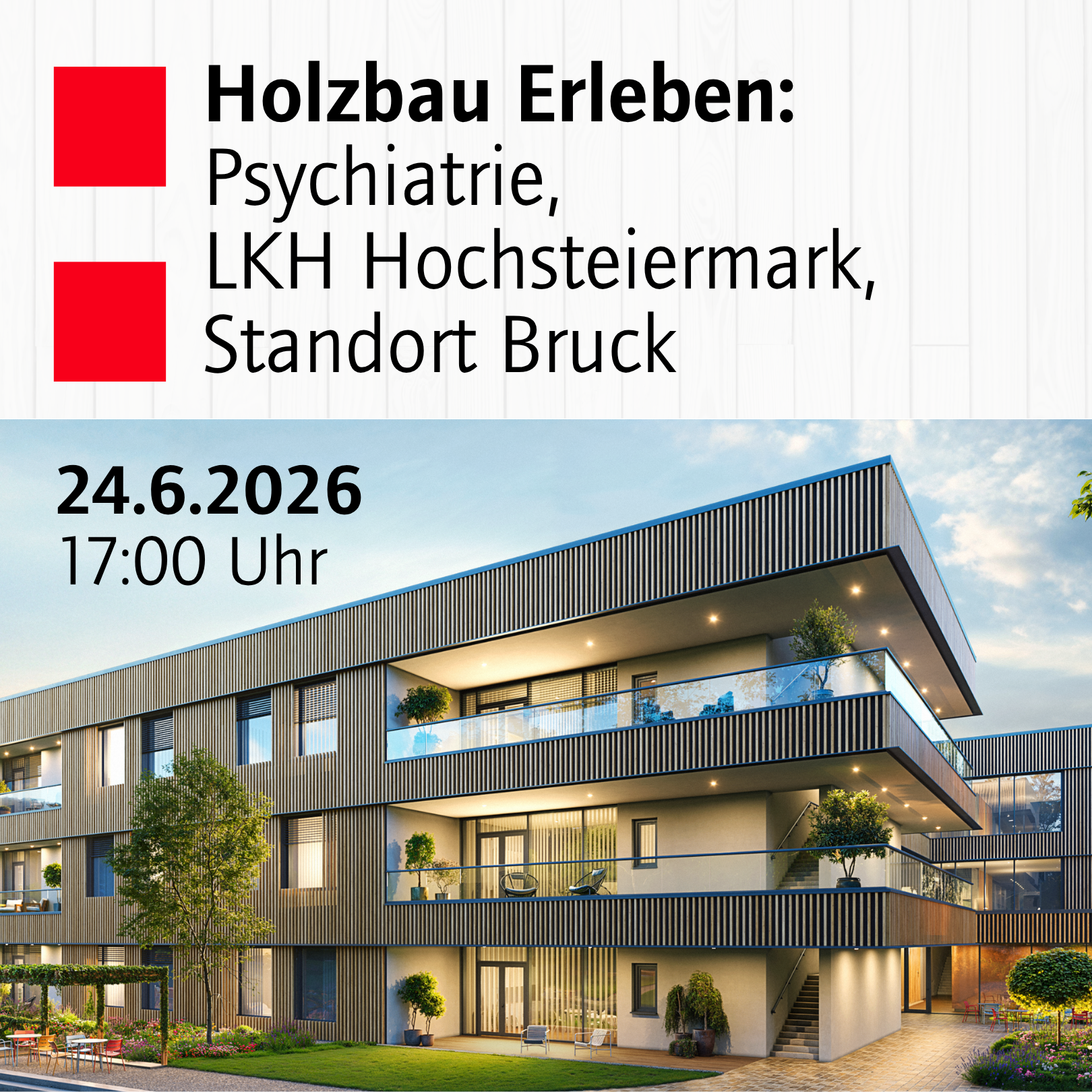 Am 24. Juni 2026 laden wir ArchitektInnen, PlanerInnen und Interessierte zur Besichtigung des Neubaus der Psychiatrie am LKH Hochsteiermark, Standort Bruck ein.
